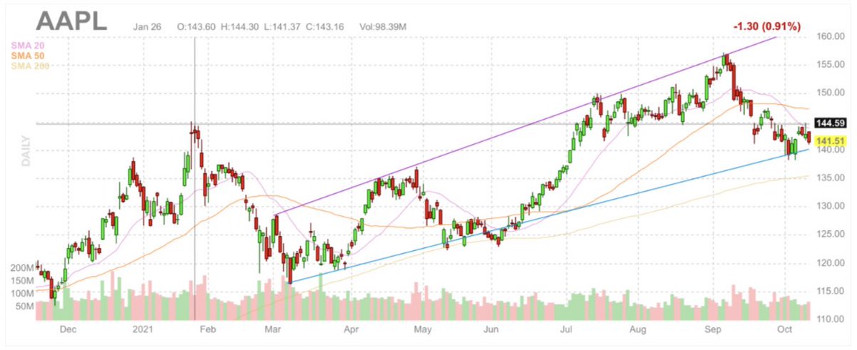 $AAPL slight hit in AH on chip supply shortage "news". I reckon this is mostly priced-in. It had been flagged on the last conf call as a risk. Chip supply a known issue across all electronics. Most would consider these units as deferred, not lost. Note the falling wedge... pic.twitter.com/f61lquV57e