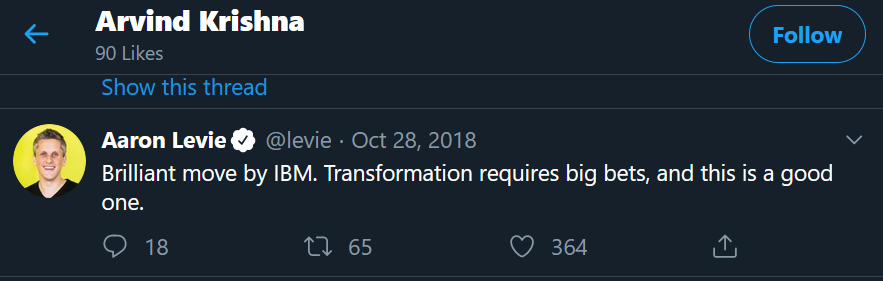$BOX fit to$IBM? Has anyone ever thought about this? Would this make any sense? Just went through Arvind Krishna's twitter and he liked a tweet from Aaron Levie (where he complimented the RDHT acquisition)pic.twitter.com/OLQiVwvFRZ