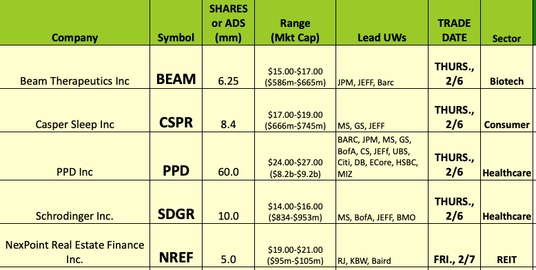 #IPOs last week ($BDTX,$ARQT,$REYN,$ONEM) w/ an average gain of 36% at 1sttrade. Biotech & related services, mattress company, REITs & More on this week’s schedule We provide color/commentary how each will open vs. issue px.$BEAM$CSPR$PPD$SDGR$NREF$ONEW$PFHDpic.twitter.com/CGmAHo6gA4