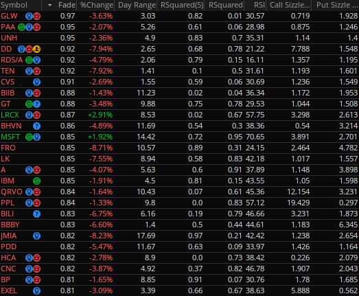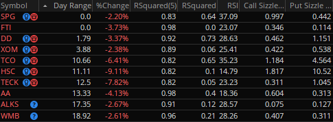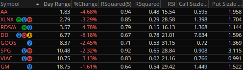 Mid-day earnings highest % below OR 30-min low, Up/Avg Gain of today's seven 30-min bars, G/L % in previous 30-Min & Trading range % (Min $5, Vol > 750K, Option Vol > 250 in any strike):