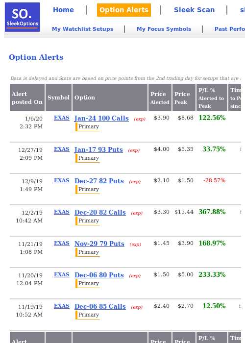 $EXAS [Jan-17 93 Puts] up +33.75% Alerted at $4.00 on Dec 27 2019 1:54PM Peak after alert $5.35 on 2020-01-17 Daily Progress: https://sleekoptions.com/st.aspx?ald=18f8bf14-4e98-4e2b-b21f-dc382737de97 … -
