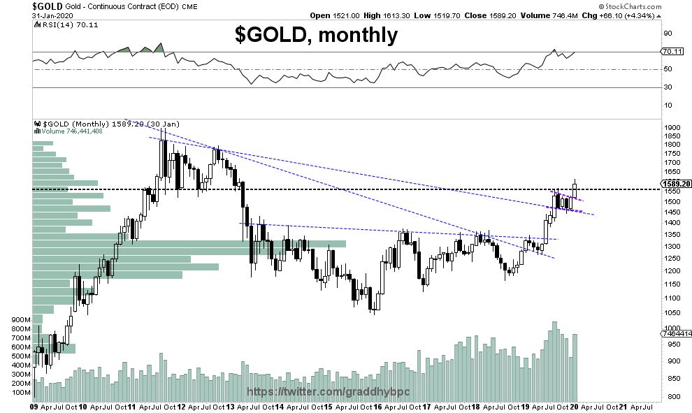 $GOLD monthly And there we have it, as expected this month, the monthly breakout plus close above the most obvious single-line resistance (dotted black) for the resistance zone from 2011-12. The three blue lines were vital, and so was this one. Gorgeous TA from gold, once again. pic.twitter.com/7Kb1N7lYe9