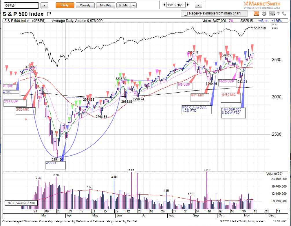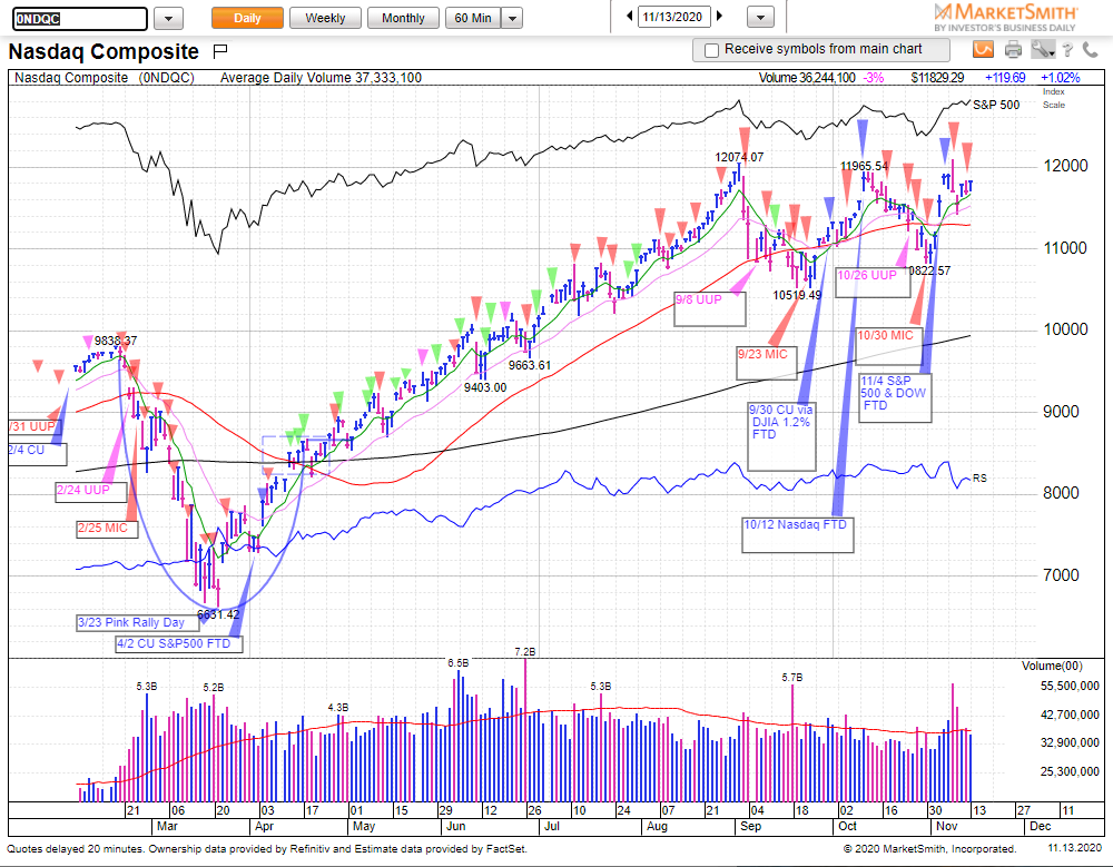 Weekend Review, 11/15: Confirmed Uptrend S&P 500 and Russell 2000 finished at all-time closing high. Distribution Days: Nasdaq - 2, S&P 500 - 1