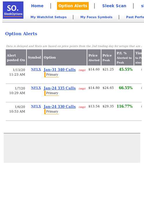 $NFLX [Jan-24 330 Calls] up +91.21% Alerted at $15.35 on Jan 2 2020 12:53PM Peak after alert $29.35 on 2020-01-24 Daily Progress: https://sleekoptions.com/st.aspx?ald=d92bddb2-89c3-40ce-a417-720197c80f95 … -