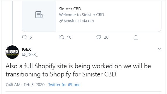 $IGEX ~ A Shopify store is also being worked on we will be transitioning to Shopify for http://SinisterCBD.com https://twitter.com/_IGEX_/status/122505300100333158 …$GTXI$DFFN$TROV$SNSS$RST$ESEA$AKER$INPX$SBOT$SEEL$TNXP$TROV$TENX$SAEX$SELB$NH$HDSN$BIG$UPLD$CLDX$FHL$RARX$DRIPpic.twitter.com/KLxrXq19eR