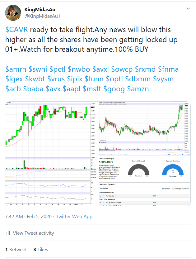 $CAVR ready to take flight.Any news will blow this higher as all the shares have been getting locked up 01+.Watch for breakout anytime.100% BUY$amrn$swhi$pctl$nwbo$avxl$owcp$rxmd$fnma$igex$kwbt$vrus$ipix$funn$opti$dbmm$vysm$acb$baba$avx$aapl$msft$goog$amznpic.twitter.com/ddRKqs3AWj