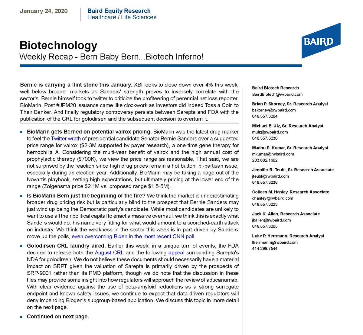 $SRPT, Buy, PO $188): SRPT preannounced $100.1mn in Exondys sales in 4Q. Main driver DMD gene therapy finished dosing in Study 102, will begin commercial-supply study 301 by mid-2020. Reit. Buy as top pick for 1H20. -