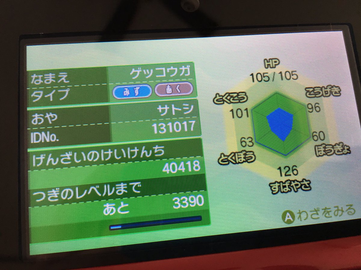 サトシゲッコウガの情報まとめると 個体値は20-31-20-31-20-31で固定 努力値はSに252、ACそれぞれに128既に振られている 性格はがんばりや 出会った日がアニポケXY初回放送の2013年10月17日になっている