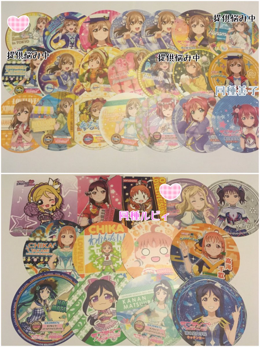 【交換/譲渡】ラブライブ!サンシャイン! コースター μ's Aqours 虹ヶ咲 セガコラボカフェ サンシャインカフェ ラブライブ!フェス JOYSOUND 譲:画像1〜3枚目 求:にこ、ことり、かすみ>善子>ルビィ、譲渡(¥400〜定価) 交換の場合4枚目優先ですがAqoursの最近のキッチンカーはほぼ未所持です。→ pic.twitter.com/tKVO4JkLNJ