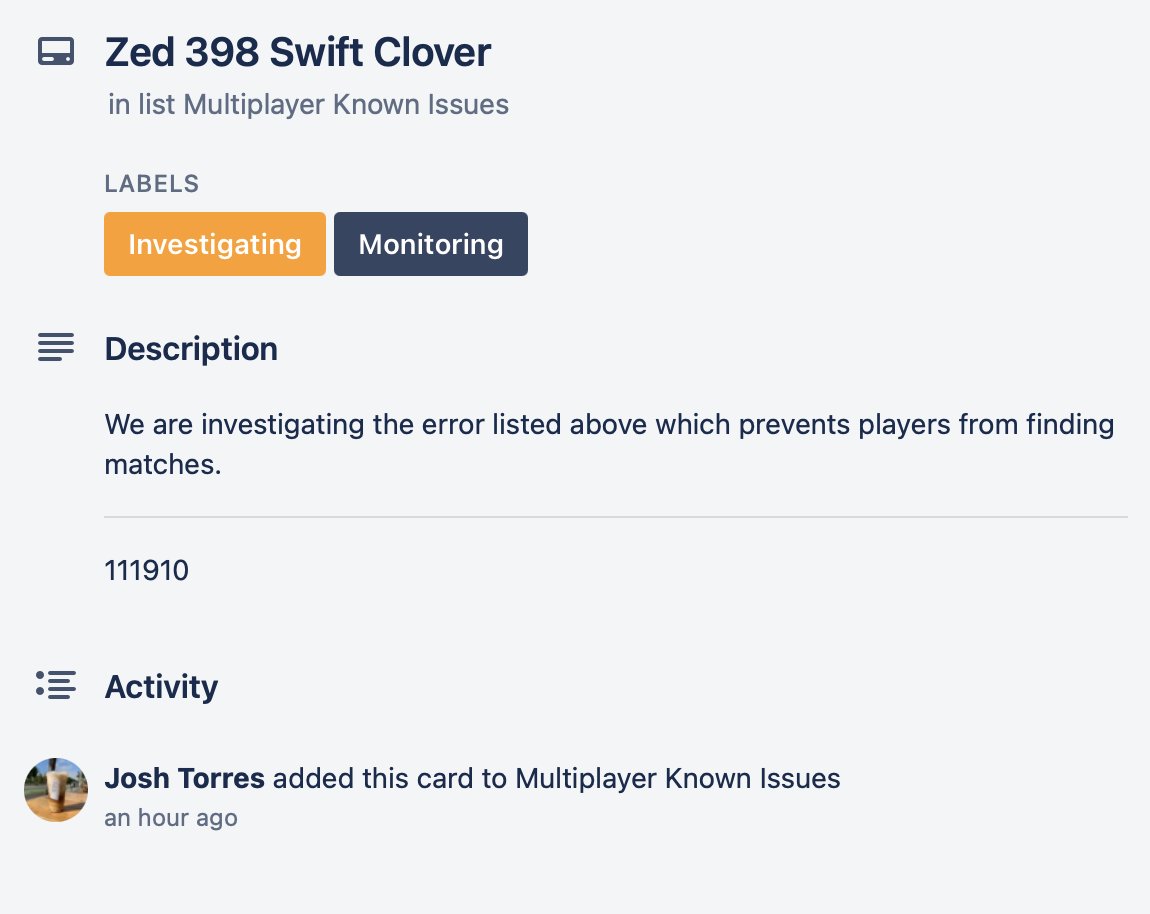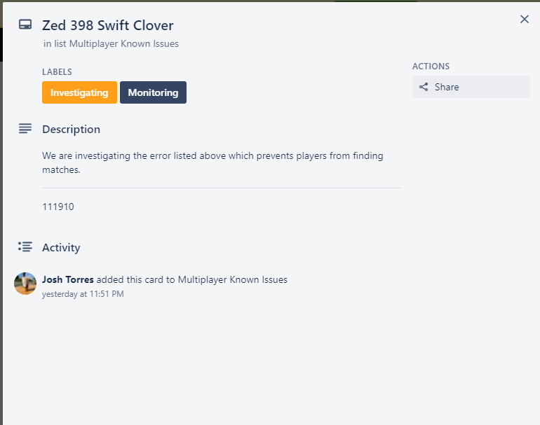 Treyarch is investigating the "Zed 398 Swift Clover" error on PC.