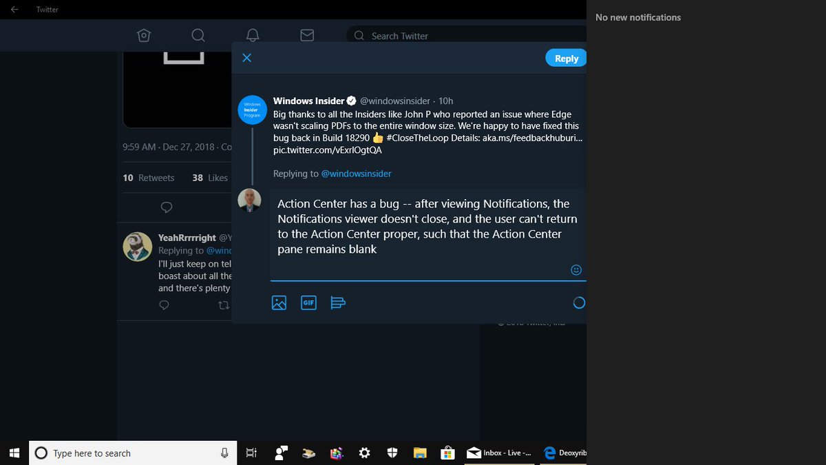 Action Center has a bug -- after viewing Notifications, the Notifications viewer doesn't close, and the user can't return to the Action Center proper, such that the Action Center pane remains blank pic.twitter.com/KokQjJu25i