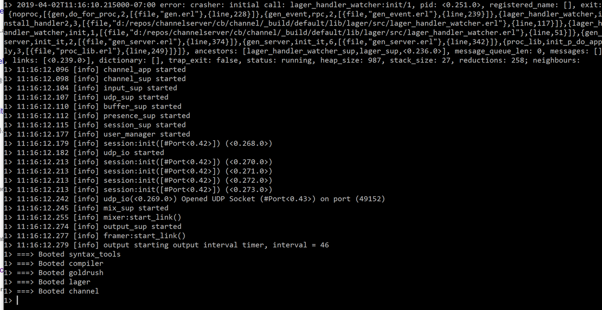 #Erlang people: Any ideas? I think the error logger redirect to lager is crashing because lager isn't started yet. I tried setting lager error_logger_redirect to false, but it didn't help. pic.twitter.com/EyurIz994U