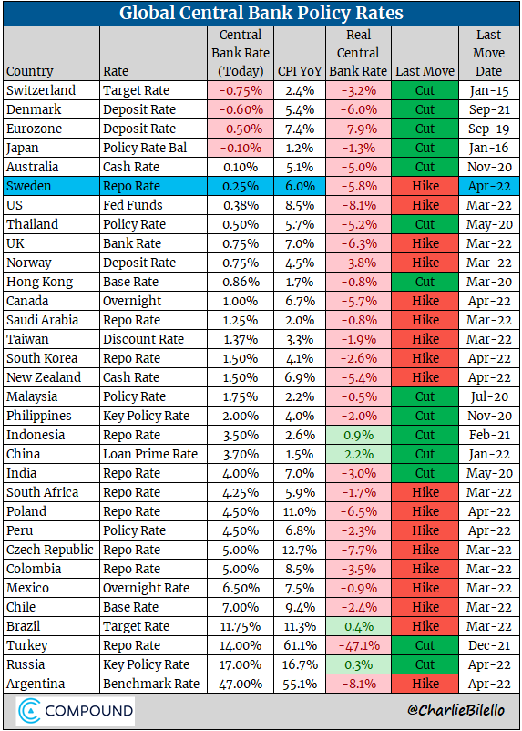 Global Central Bank Rate: -Sweden hiked rates for the first time since 2019, a 25 bps increase to 0.25%. The last time its policy rate was above 0% was in 2014. The central bank signaled 2-3 more hikes this year. pic.twitter.com/UDfo9lAbhF