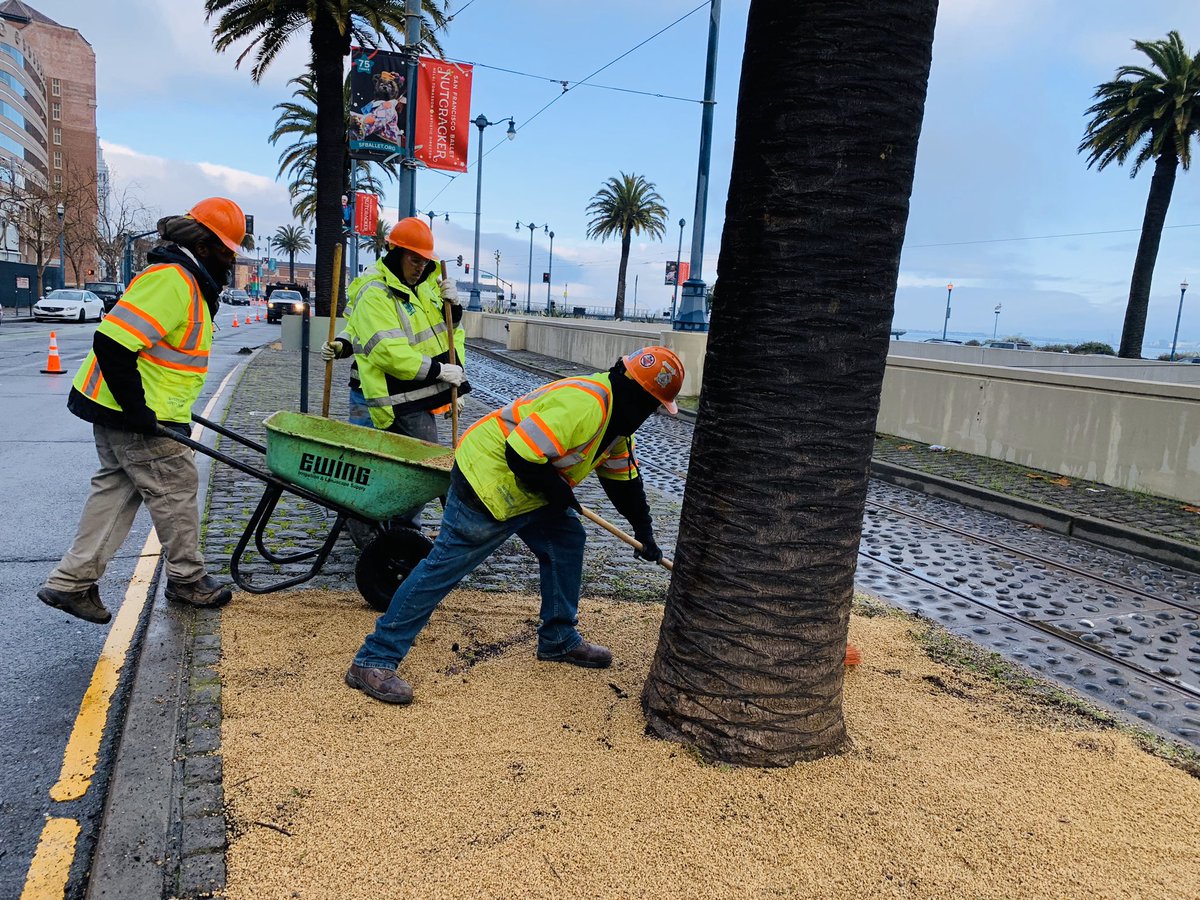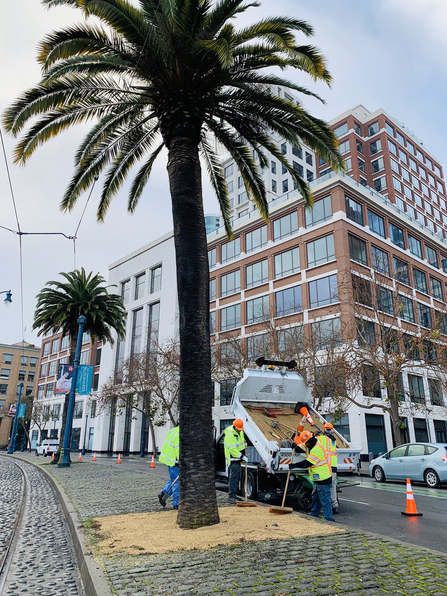 Our Bureau of Urban Forestry crews out on The Embarcadero this morning freshening the tree basins of the iconic palms.