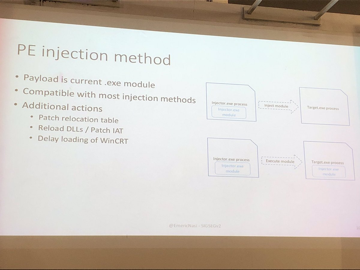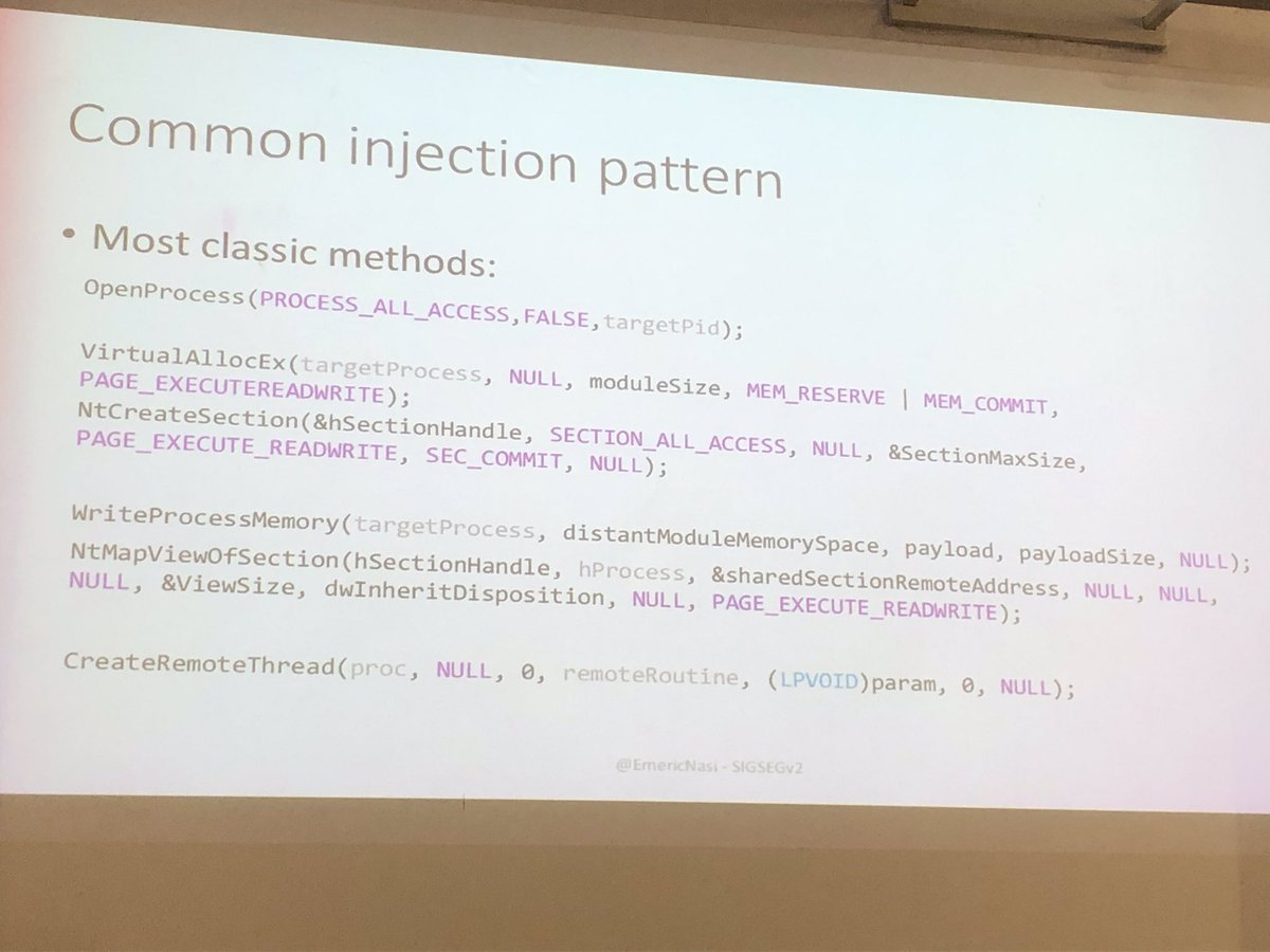 #SigSegv2 Militarisation de l’injection de code dans un autre processus par@EmericNasi « pas de Shellcode, pas d’#API connue, adresse légitime, pas de mémoire en écriture, code générique contournant les protections#Windows sans être administrateur, ... »#RTFM@sigsegv_eventpic.twitter.com/209q6yZPpt – mjesto: Campus IONIS : Epita - Epitech