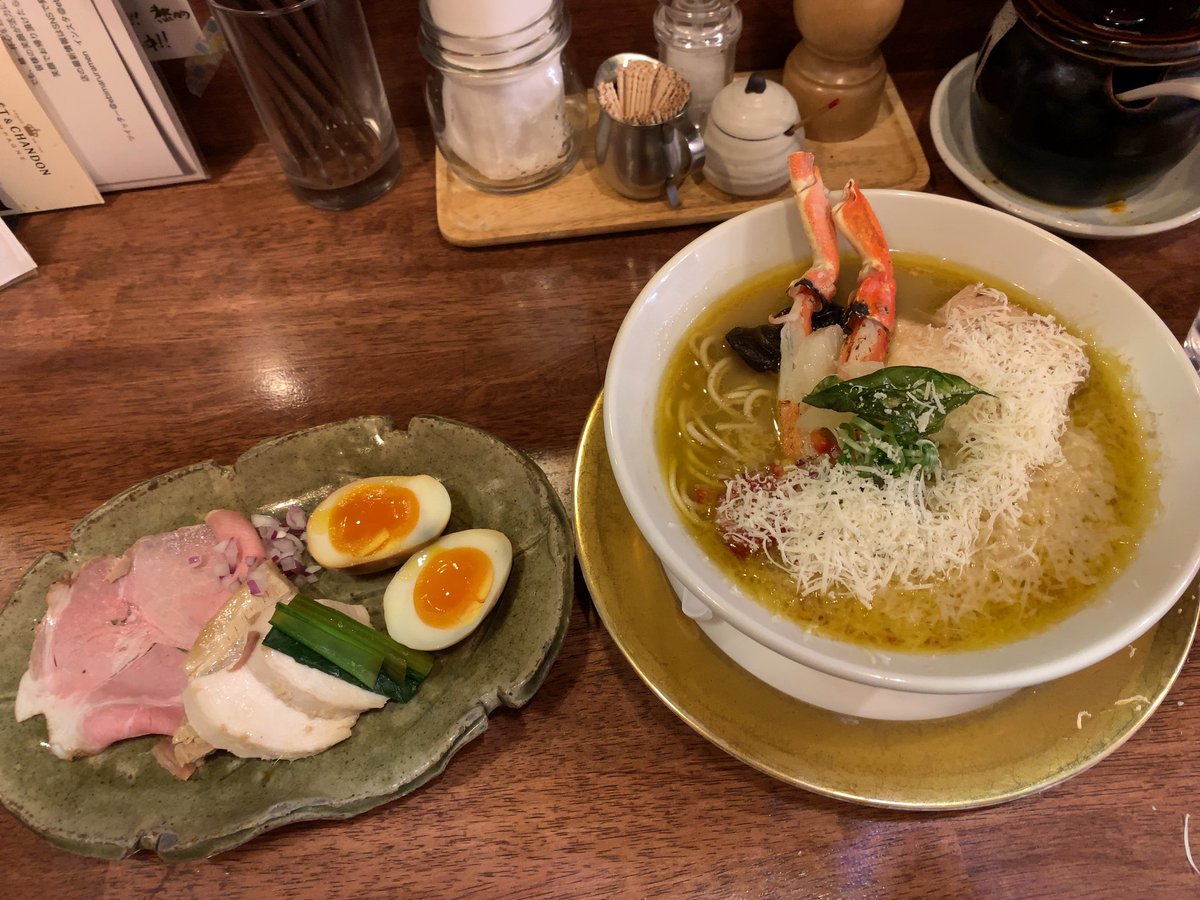 海老丸らーめん@神保町 北海道紋別産本ズワイガニのらーめん 肉増し くんたま増し チーズ削り リゾット 残りまだありますのツイートみて、 行ってしまいました