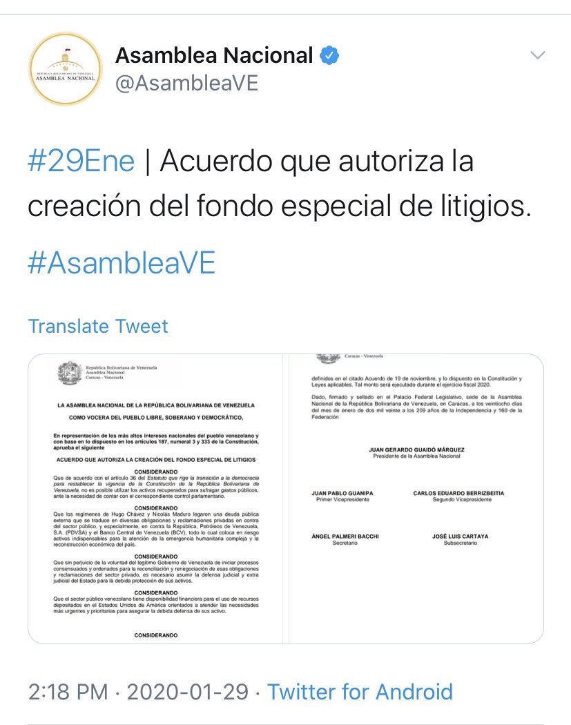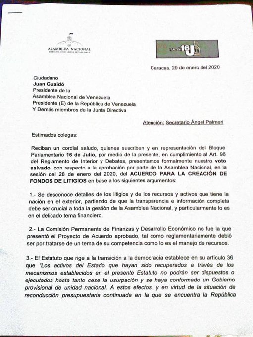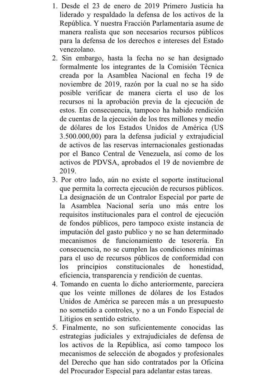 Desde Primero Justicia queremos anunciarle al país las razones por las que nuestra fracción parlamentaria salvó su voto sobre el Acuerdo que autoriza la creación del Fondo Especial de Litigios, aprobado en sesión ordinaria celebrada el día martes veintiocho (28) de enero de 2020