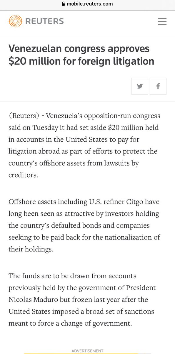 Primero Justicia afirma que 20 millones de dólares aprobados por una parte de AN liderada por VP, partido de Guaidó, para usarse en litigio de PDVSA: Es ilegal y pareciese más una “partida secreta.” Denuncián también la desaparición de 3.5 millones d dólares. SALVARON EL VOTO! https://twitter.com/Pr1meroJusticia/status/1222675031240642561 …