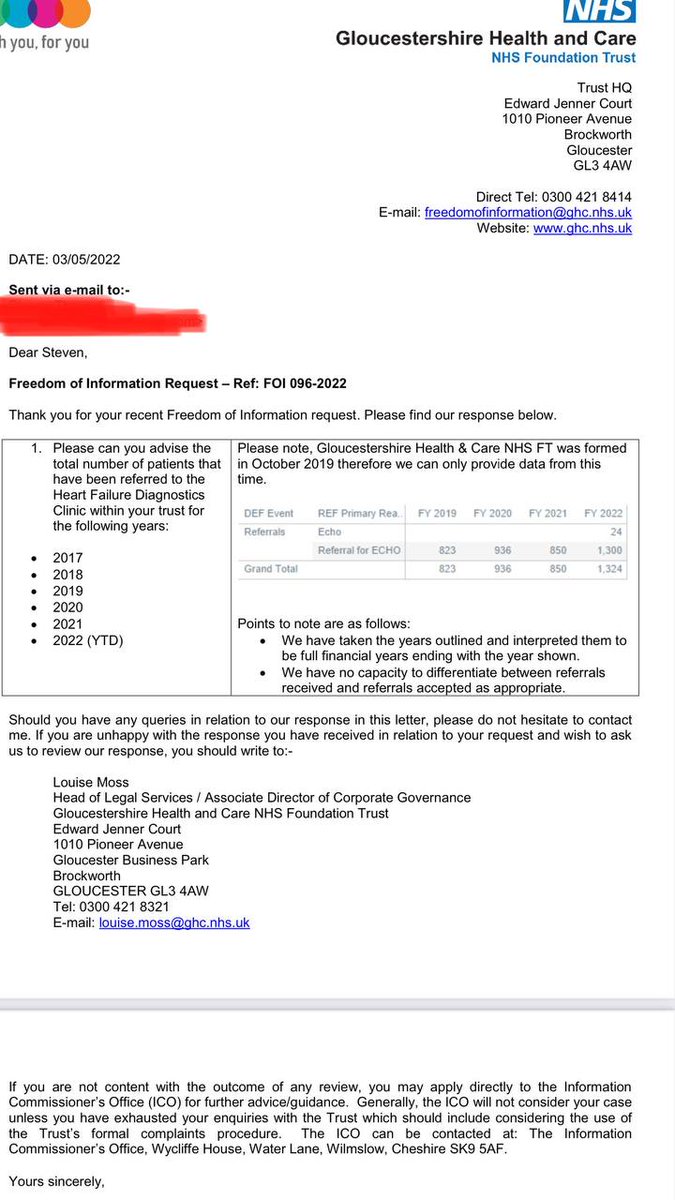 A freedom of information request was done by a member of our group. Not looking good is it? Considering we have just started May? Submitted to Glos Health regarding Heart Failure Referrals. pic.twitter.com/tLKP5ATJt4