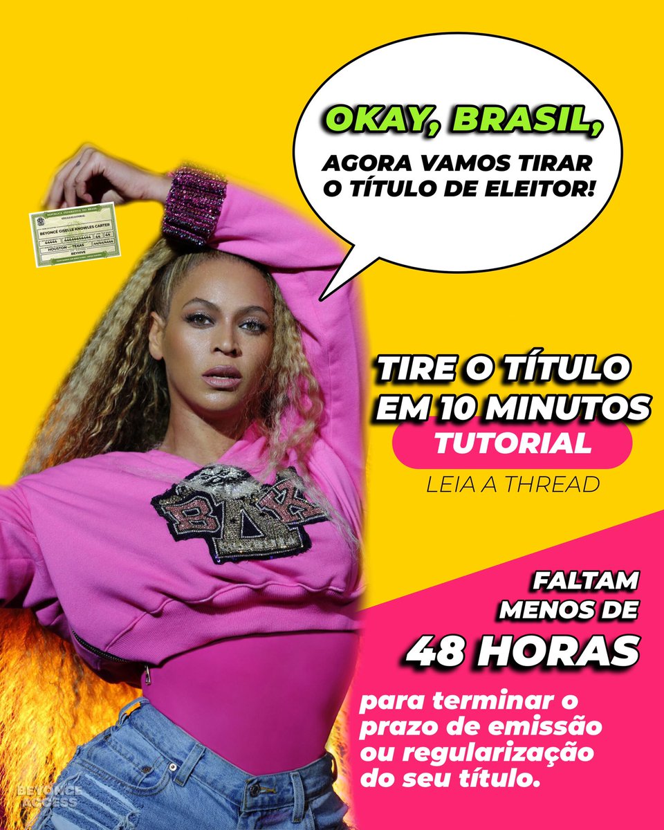 ÚLTIMA CHAMADA! Tire o seu título de eleitor agora seguindo o passo a passo nesta thread. Simples, fácil e rápido. Como a Beyoncé diz: Vamos entrar em formação! #FandomsPeloVotopic.twitter.com/vB3K0eVLHn
