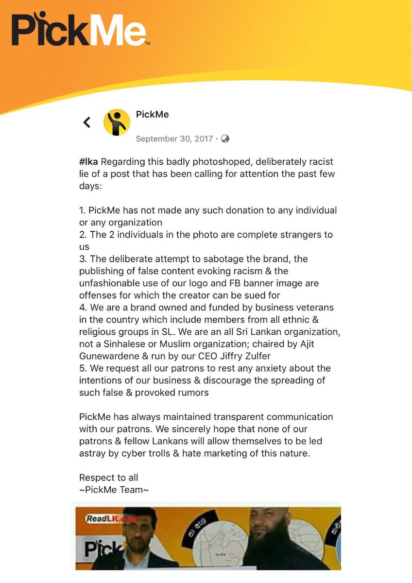 It has been brought to our notice that a malicious & fabricated image falsely accusing PickMe, is making its rounds on social media once again. We would like to reiterate that we stand firmly with the people of the nation