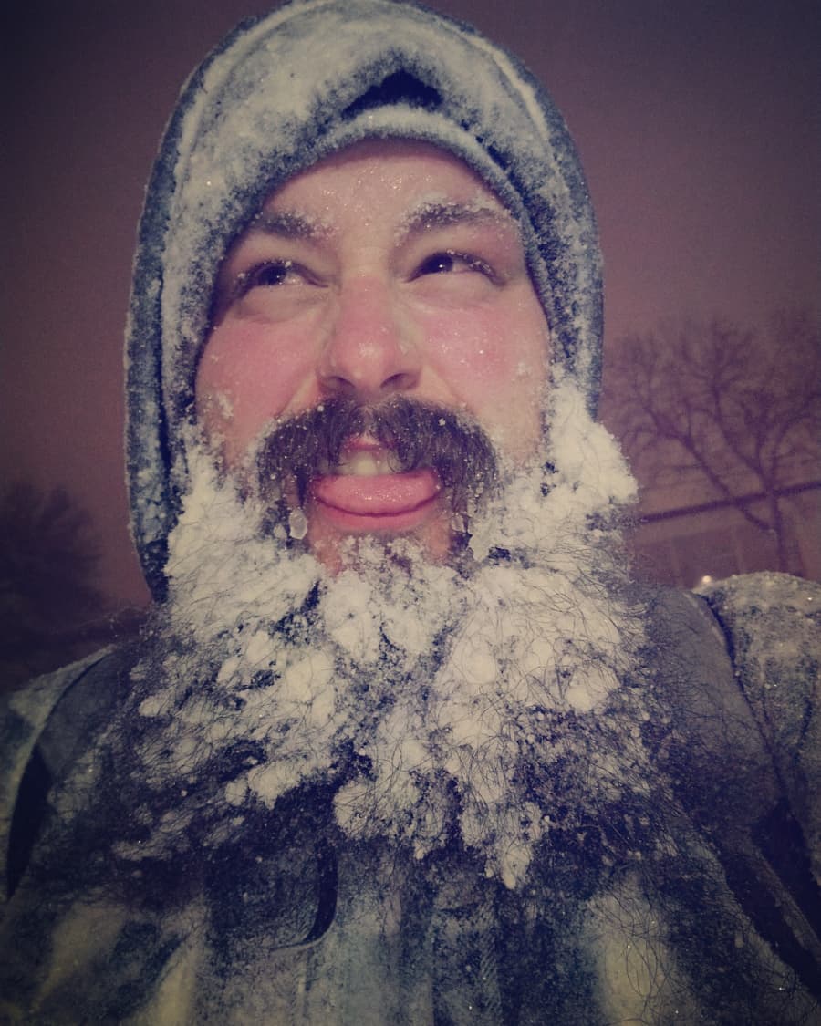 It wasn't cold but it was annoyingly windy. The snow accumulated on my beard as it does atop a mountain peak. All in all I enjoyed my walk home even though I slipped everywhere. Also I was really hoping to because I am now 1.2km from 50km this week in Pokemon GO. pic.twitter.com/IftPpKPf2r