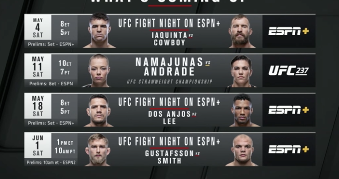#UFC Main Card start times: ESPN+9 8PM ET UFC 237 10PM ET ESPN+10 8PM ET ESPN+11 1PM ET pic.twitter.com/eviNz54ehw