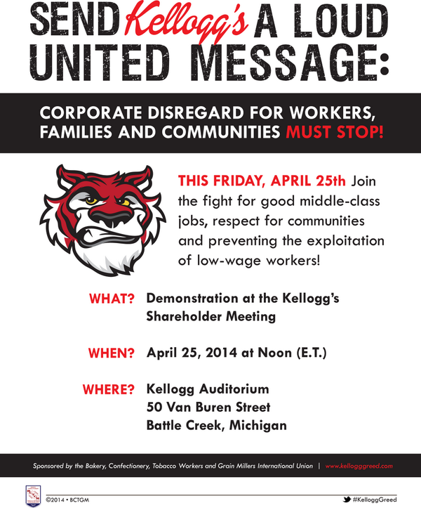 @Kelloggs_US a loud message Friday in Battle Creek - join us!@BCTGM@MIAFLCIO#KelloggGreed pic.twitter.com/ivvKpvACmv