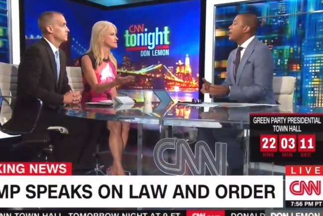 Watch an angry, crazed, very biased Don Lemon badger and cut off Kellyanne Conway after inviting her on: http://www.mediaite.com/online/why-are-you-badgering-me-don-lemon-takes-on-trump-adviser-when-she-wont-answer-question/ …