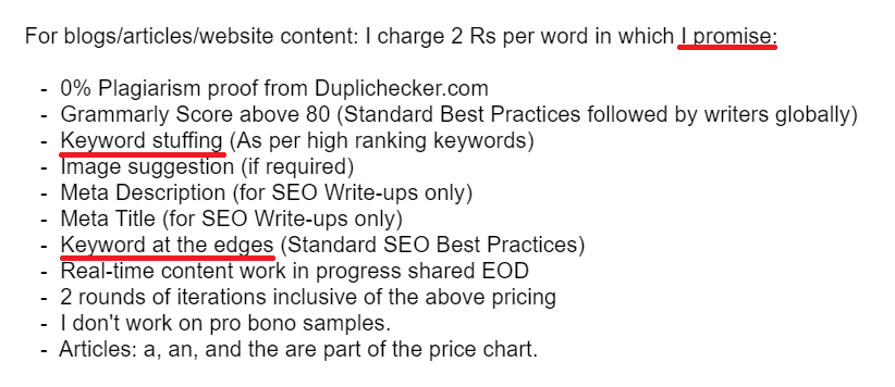 I tried to hire a content writer or two.. and I got lucky! I was promised "keyword stuffing" for the throwaway price of ₹2 per word. I also learnt about the existence of an