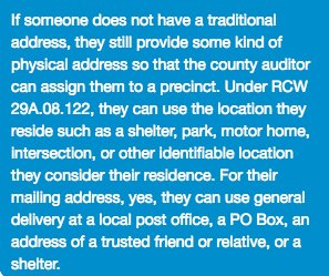 If you are houseless you can still vote. https://weiapplets.sos.wa.gov/MyVoteOLVR/MyVoteOLVR/Qualifications …pic.twitter.com/Fa6BdECTig