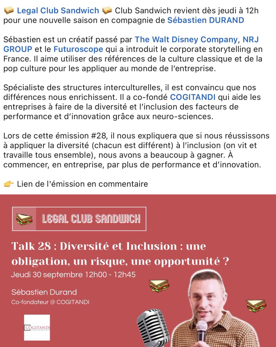 #Diversité et#Inclusion : une obligation ? un risque ? une opportunité ! Ce jeudi à 12h je répondrai aux question de@pierrelandy@ThibautCaoudal et#AudreyDéléris sur le podcast#LegalClubSandwich. Toutes questions bienvenues. Lien de l'émission