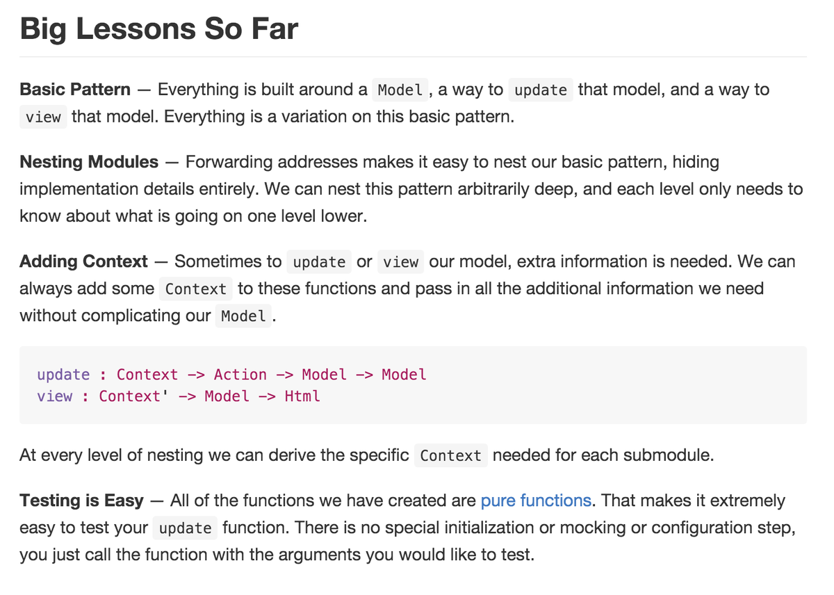 https://github.com/evancz/elm-architecture-tutorial/#big-lessons-so-far …