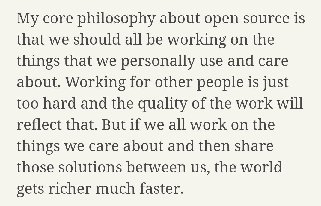 This article from DHH back when Merb (the project I maintained that competed with Rails) merged into Rails is a good explanation of the philosophy I adhere to. https://dhh.dk/posts/36-work-on-what-you-use-and-share-the-rest …