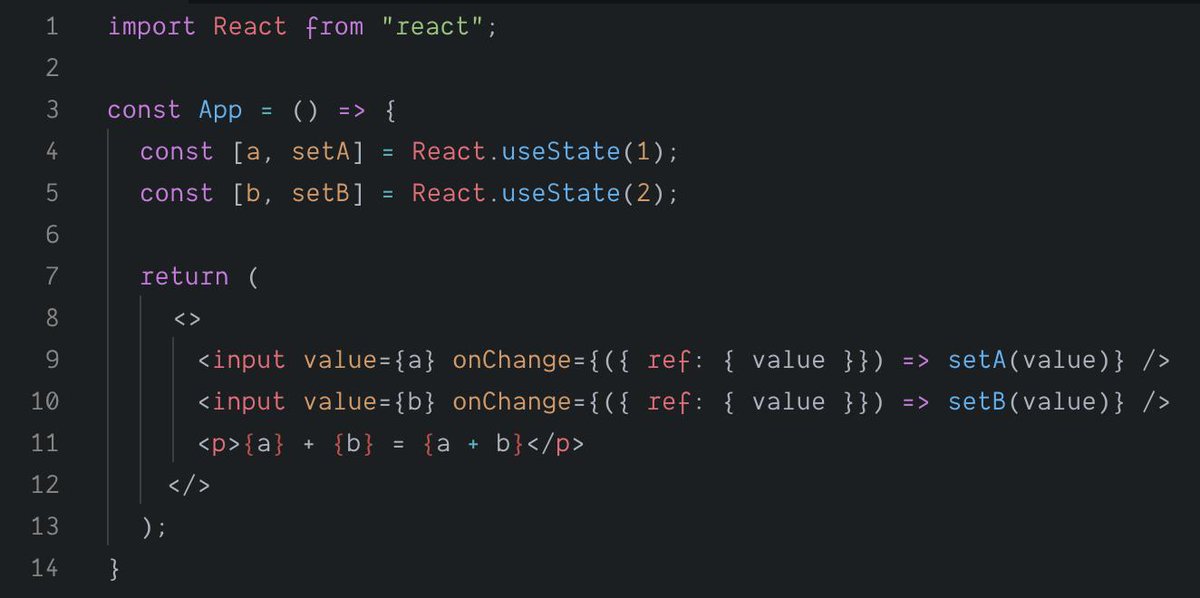 There's a lot of superfluous syntax there, some of it due to JSX. Also don't really understand what the value is in using destructuring if it's clear to not use it at all, eg: onChange={(event) => setA(+http://event.target .value))