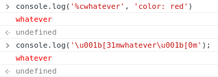 ICYMI: You can format console message with CSS in Chrome. Pretty cool, very powerful. BUT, if you want to format console messages for most terminals (node.js output) *and* Chrome, you can use ANSI codes. It's more limited, but gets the job done. https://en.wikipedia.org/wiki/ANSI_escape_code#3/4_bit …pic.twitter.com/RmEmWktTI4