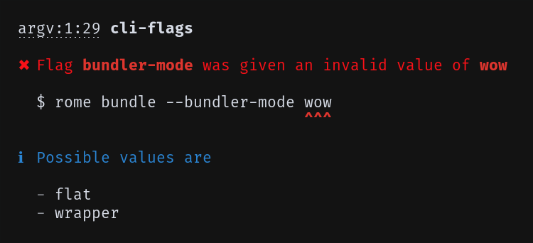 Whenever Rome complains about CLI arguments or flags it will output a code frame with the problematic portion highlightedpic.twitter.com/cxRZ6ZCV35