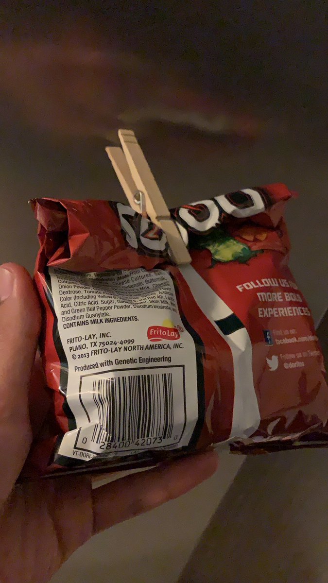 I just ate seven Doritos from this miniature bag, wrapped it up, put a clip on it, and stashed it back in the cupboard. Like a fucking psychopath.pic.twitter.com/zOJhEK6Eun