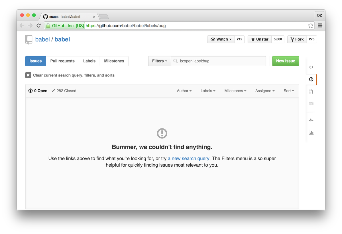 The feeling of having no (known) bugs is so satisfying. https://github.com/babel/babel/labels/bug …