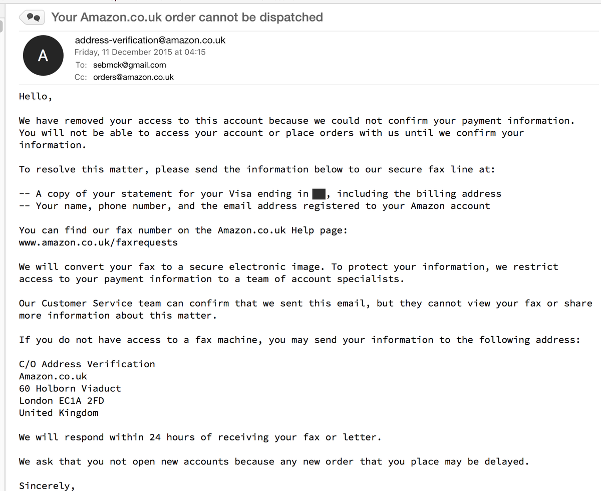 Are you fucking serious @amazon? You lock my account and want me to FAX you a copy of my bank statement? It's 2015.pic.twitter.com/5N17MZfZGI