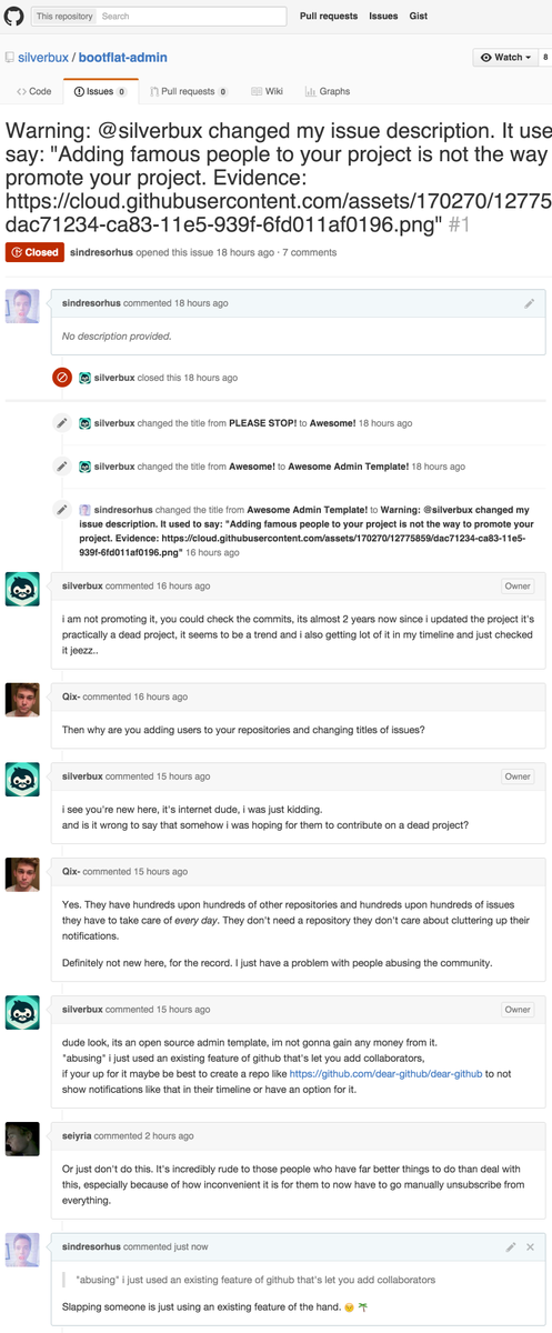 The latest "trend" of adding famous GitHub users to a repo to promote it is so lame... https://github.com/silverbux/bootflat-admin/issues/1 …pic.twitter.com/sNuq91M3m3