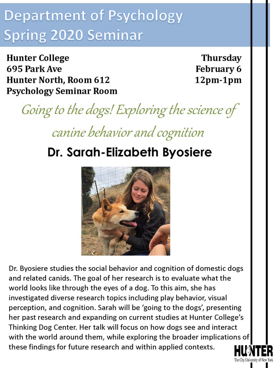 @sebyosiere, the director of@HunterTDC! The seminar will be this Thursday, Feb 6 at Noon. Title: "Going to the dogs! Exploring the science of canine behavior and cognition." We hope to see you there!#PsychatHunter#HunterCollegepic.twitter.com/hV3SAkjJay