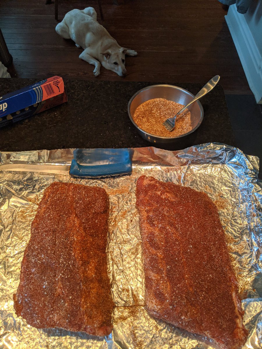 Baby backs about to go on the smoker. We have an interested party in the background.pic.twitter.com/IctMdHotg3
