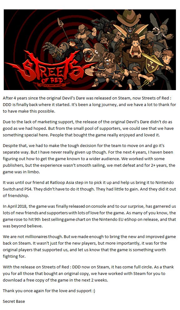 A good/bad news for SoR:DDD Steam supporters The good - We've gotten a publishing partner that is able to help us reach out to a wider audience. Making the game known to more. The bad - Launch is pushed back slightly to give them enough time to properly prep and market the game