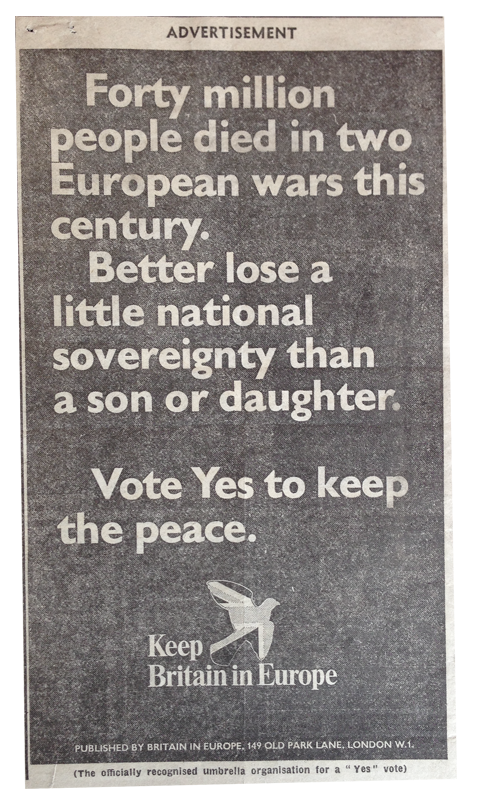 Wow. A Pro-EEC poster from the first referendum in 1975. "Forty million people died in two European wars this century. Better lose a little national sovereignty than a son or daughter."pic.twitter.com/WPbH03Q3ft