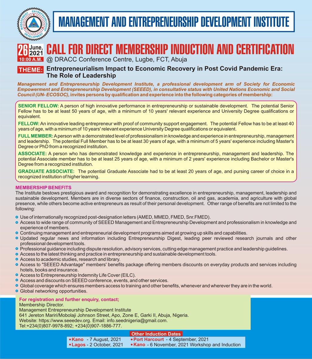 Management and Entrepreneurship Development Institute provide and promote comprehensive and scientific knowledge of entrepreneurship and its relationship with leadership, etc. Join us today for Direct membership induction, by qualification and experience https://forms.gle/Ddq8b8faRuYzpTeP6 …pic.twitter.com/v5JZbb3piI