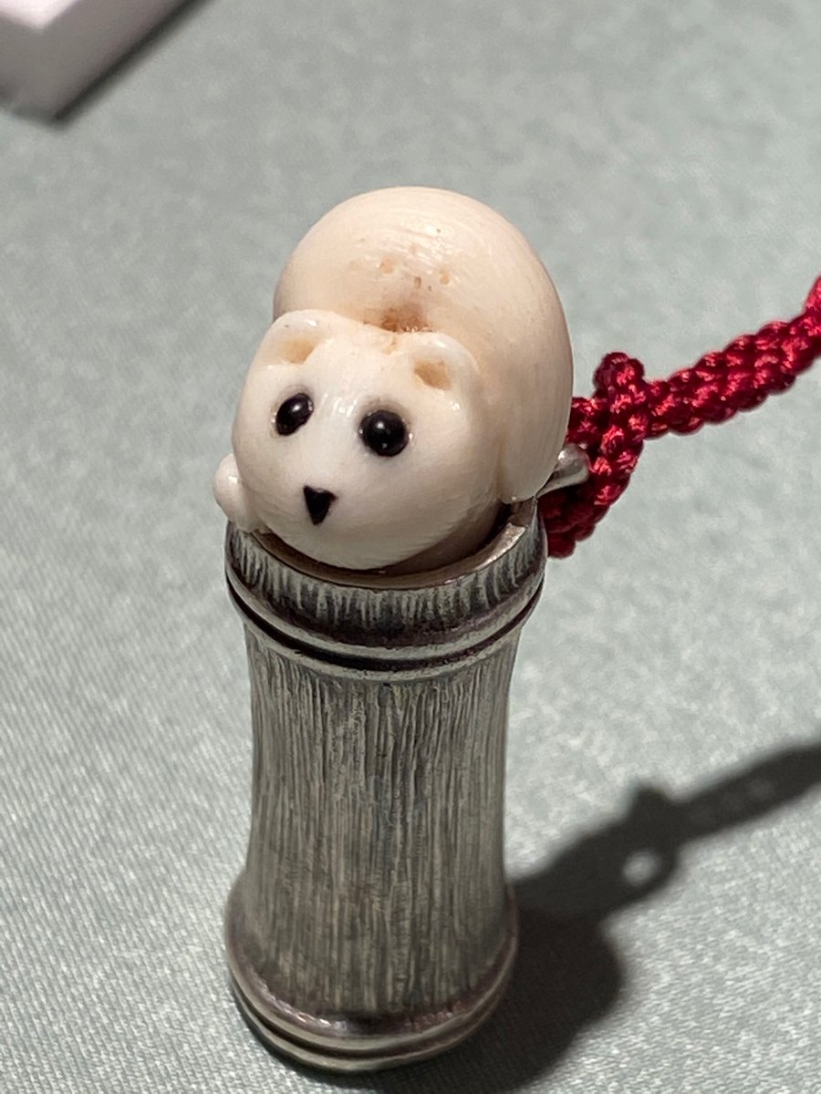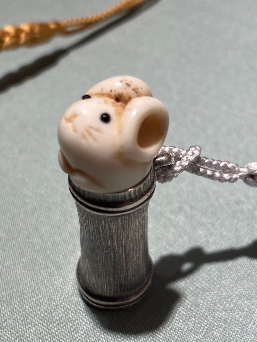 【和こもの展】で展示していた根付作家 中梶真武さんの提げ小物 ①管キツネ②管イタチ③ 管ネズミ