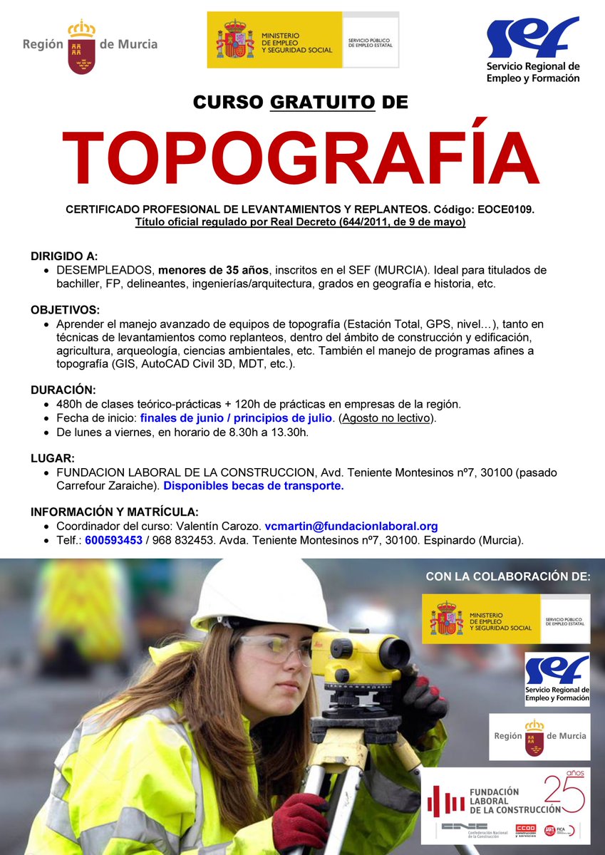 ¿Quieres formarte en un sector con futuro? @Fund_Laboral vuelve a convocar un curso de topografía del SEF con 120 horas de prácticas en empresas.