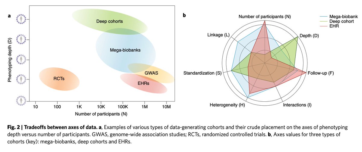 We discuss various tradeoffs in constructing human cohorts such as that between the scale of the data gathered (axis N) and the depth of the data (axis D), and show where different cohorts lie, including mega biobanks (e.g., UKBiobank), genetic datasets, EHR datasets, etc.pic.twitter.com/YUMb742YjE