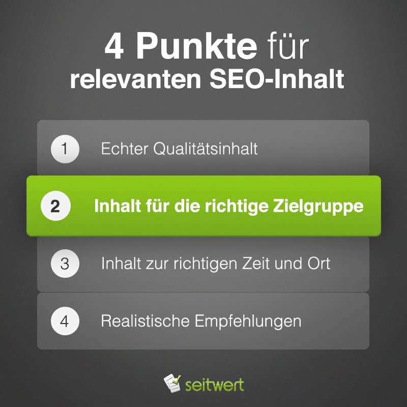 Expertentipp: 4 Punkte für relevanten SEO-Content - Inhalt für die richtige Zielgruppe http://bit.ly/28Mv2UD pic.twitter.com/LBf3CO5Dwn